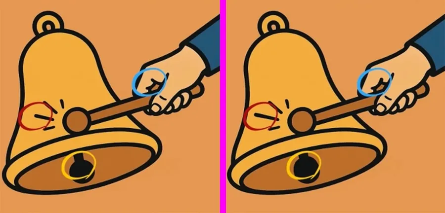 Dacă nici până acum nu ați găsit cele trei diferențe, o să deslușim misterul și o să indicăm locul în care acestea apar. Așa cum spuneam, două dintre diferențe se regăsesc la nivelul clopotului, iar a treia este sesizabilă la nivelul mâinii. Toate cele trei diferențe sunt evidențiate mai jos.