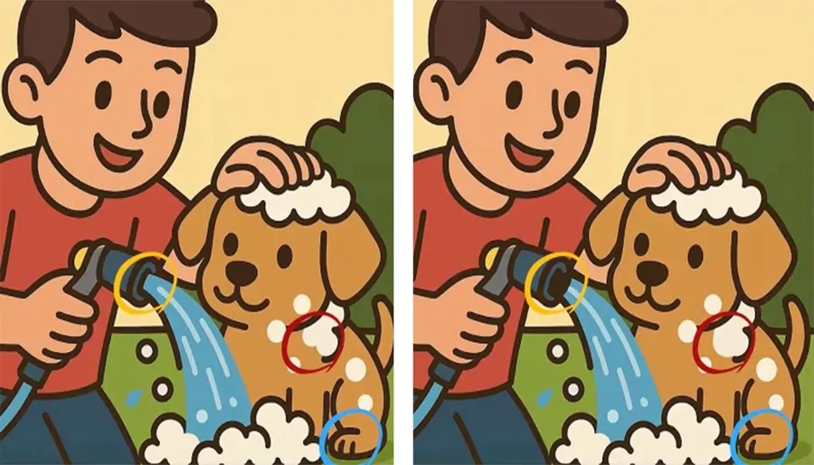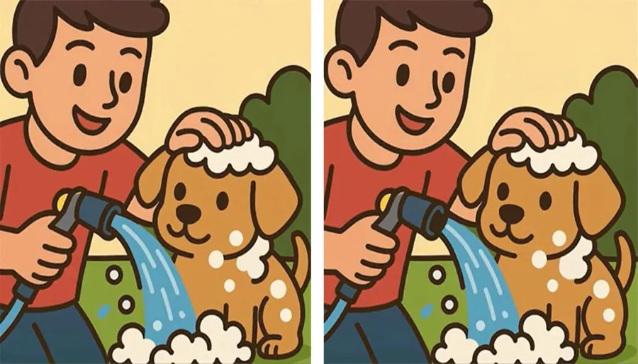 În centrul puzzle-ului se află un băiat surprins în două imagini aproape identice, în timp ce își spală câinele. Deși la prima vedere totul pare perfect la fel, misiunea ta este să găsești cele 3 diferențe ascunse. Atenţie! Ai la dispoziţie doar 30 de secunde.