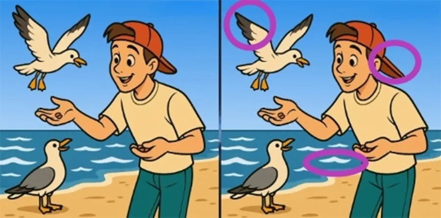 Dacă nici până acum nu ați găsit cele trei diferențe, o să deslușim misterul și o să indicăm exact locul în care acestea apar. Prima diferență se regăsește la nivelul pescărușului din aer, a doua la nivelul cozorocului șepcii, iar a trei în apa mării. Toate cele trei diferențe sunt evidențiate în imaginea de mai jos.