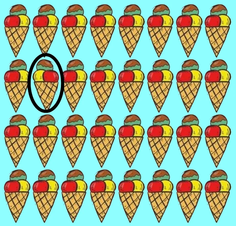 Crezi că ai ochi de vultur și o atenție la detalii peste medie? Avem pentru tine un test vizual care îți va pune mintea și privirea la încercare! Aceasta nu este doar o simplă ghicitoare pentru copii, ci un test vizual. În imagine se află 32 de cornete de înghețată aranjate ordonat.