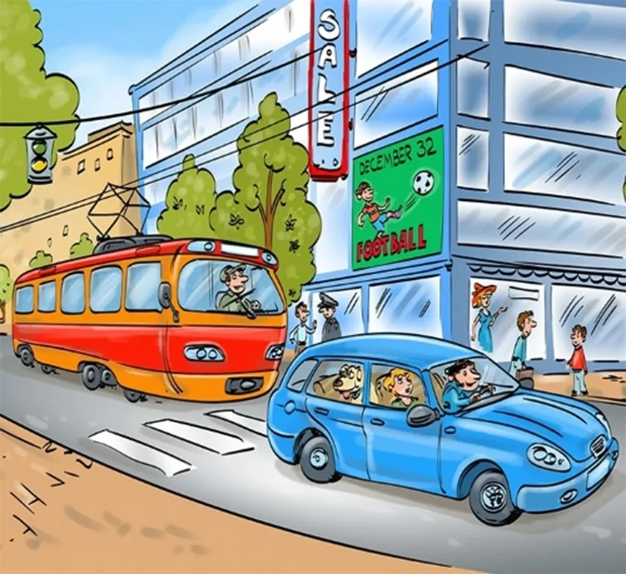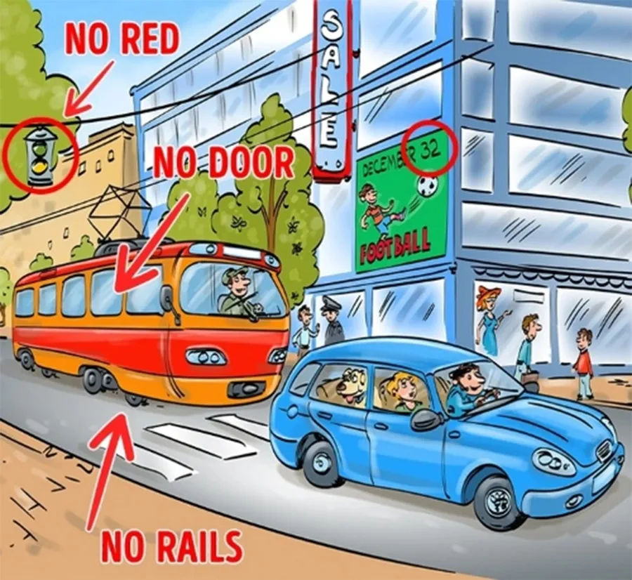 A venit momentul să aflați răspunsul corect. Ei bine, dacă vă uitați cu atenție, veți observa că tramvaiul nu are ușă și nici șine pe care să meargă. O altă greșeală este data trecută pe posterul de pe clădire – 32 decembrie. În ceea ce privește a patra greșeală, este vorba despre lipsa culorii roșu de la semafor.