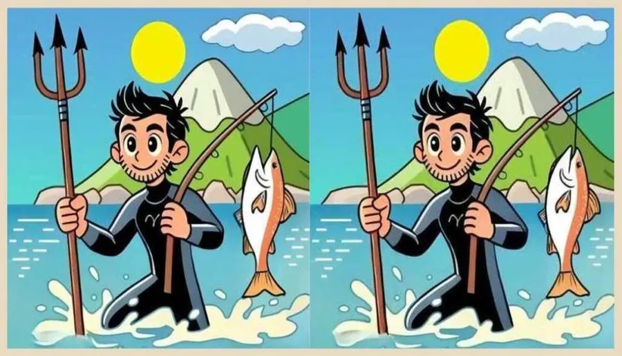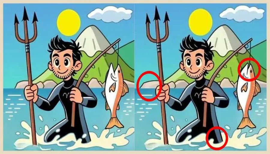 REZOLVARE: Timpul a expirat! Felicitările se îndreaptă către cei care au găsit cele trei diferențe ascunse în imagine. Pentru cei care nu au reușit, vă vom oferi răspunsul. Mai exact, prima diferență se regăsește în partea stângă a imaginii, la nivelul muntelui. A doua diferență se regăsește în partea de jos a imaginii, la nivelul valurilor. Iar a treia diferență se poate observa în partea dreaptă a imaginii, la nivelul gurii peștelui. În imaginea de mai jos sunt încercuite cele trei diferențe.