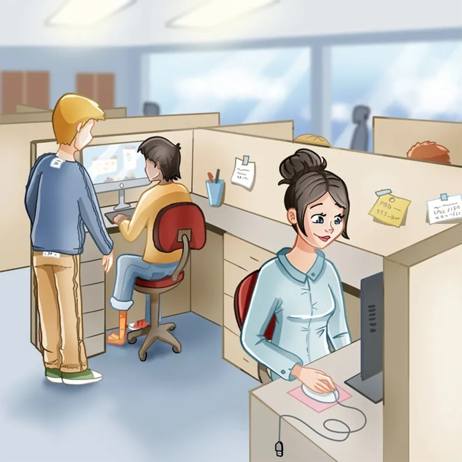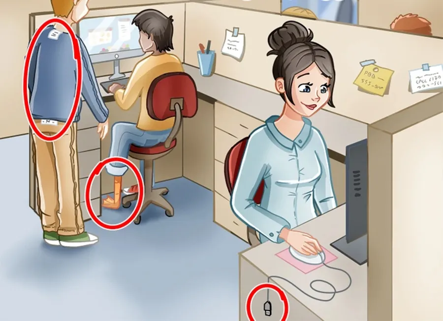 Ei bine, există câte o greșeală la fiecare persoană din fotografie. Dacă vă uitați cu atenție, veți observa că bărbatul care stă jos are un picior de rață, iar cel care stă în picioare, lângă el, poartă bluza pe dos, motiv pentru care se văd etichetele. În ceea ce o privește pe femeie, aceasta folosește un mouse care nu este conectat la calculator.