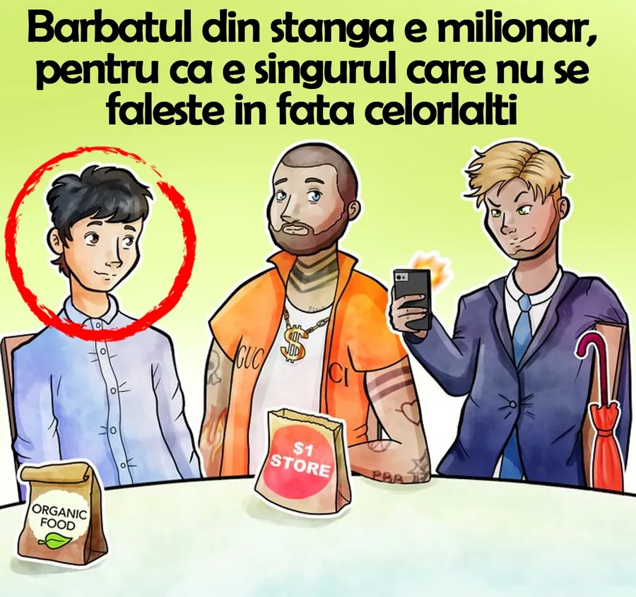 În imagine sunt prezentate trei persoane care se află în jurul unei mese. Dacă ai reușit să descoperi milionarul, felicitări, este bărbatul din stânga, pentru că este singurul care nu se fălește în fața celorlalți.