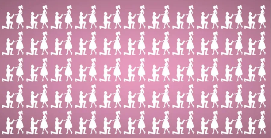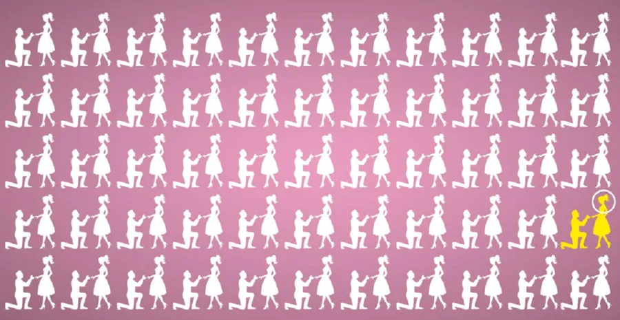 REZOLVARE: Ai la dispoziție doar 10 secunde să găsești perechea diferită. Timpul a trecut. Crezi că ai reușit să duci până la capăt testul de observație? Dacă nu, în imaginea de mai jos vei găsi rezolvarea. Cuplul diferit este pe a patra coloană, ultimul din dreapta, iar diferența se poate observa că este la părul femeii.