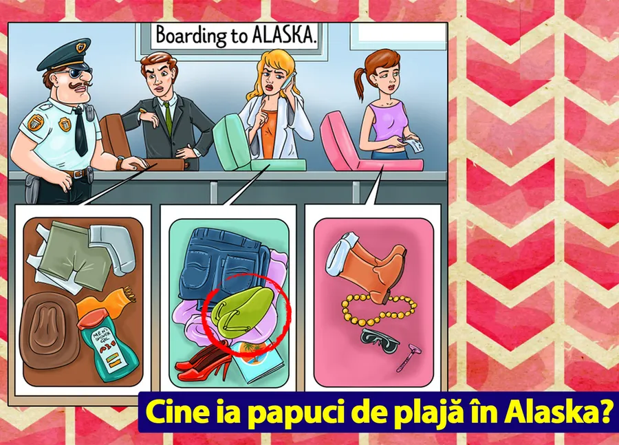 Așadar, dintre cei trei pasageri, suspectul este femeia din mijloc. De ce? Se poate observa în imagine că indiciul este chiar în valiza ei. Așa cum am menționat mai sus, nu trebuia să neglijați bagajele călătorilor. Doamna a luat cu ea o pereche de papuci de plajă, deși se îndreaptă către Alaska, o zonă cu temperaturi scăzute. Acest lucru le-a dat de gândit polițiștilor și ar fi fost bine să îți dea și ție!