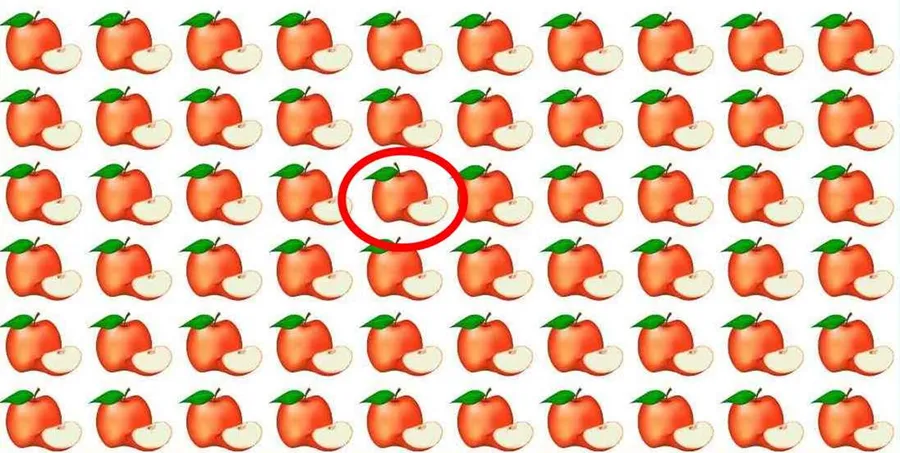 Imaginea de mai sus înfățișează o mulțime de mere, însă la prim vedere par să fie toate la fel. Ei bine, ele nu sunt. Unul dintre ele este diferit de celelalte. Privește cu mare atenție fiecare măr în parte. Felicitări celor care au reușit să găsească mărul diferit. Pentru cei care încă nu au descoperit diferența o să vă ajutăm cu rezolvarea acestei provocări. Mărul diferit se află în mijlocul celei de-a cincea coloane, iar codița acestuia este cea care este diferită de toate celelalte – fiind îndreptată în partea stângă.