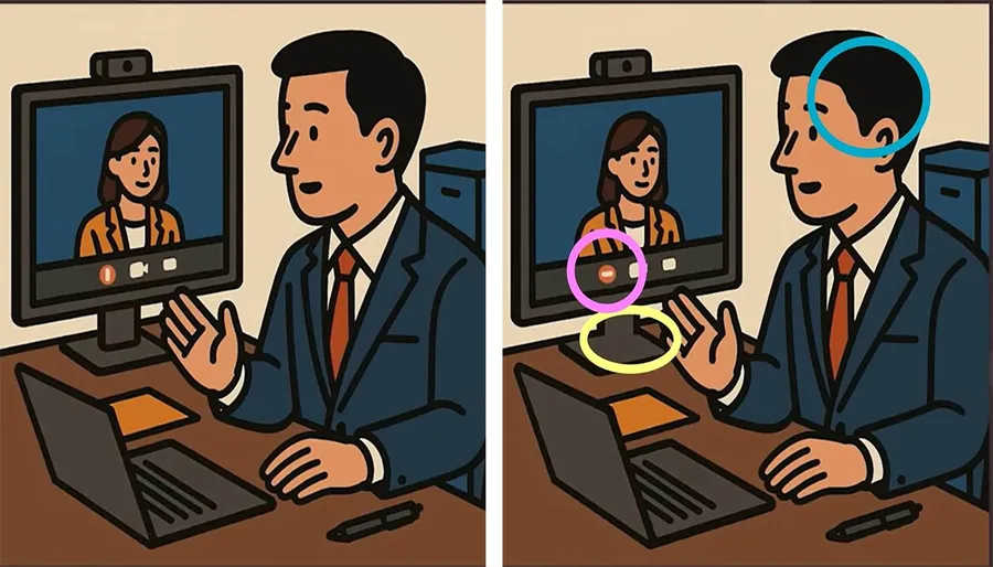 Trebuie să privești cu atenție imaginile de mai sus. Doi corporatiști participă la o ședință online. La prima vedere, imaginile par identice, dar diferențele sunt ascunse la vedere. Priviți fundalul, elementele acestuia sunt adesea modificate doar pentru a vă induce în eroare, așa că priviți cu atenție întreaga scenă. Nu-ți pierde concentrarea și continuă să analizezi fiecare mic detaliu. Poate fi vorba chiar și despre forma unui obiect.