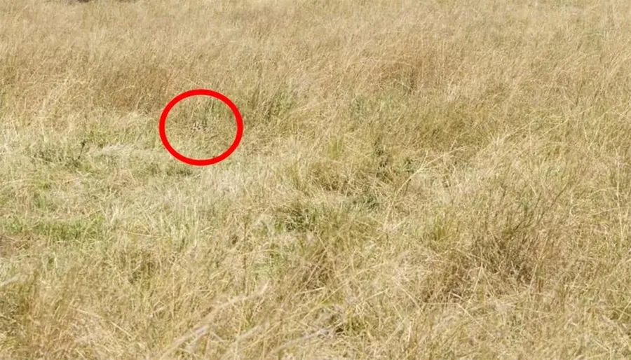 Dacă privești cu atenție imaginea, vei reuși să zărești ghepardul ascuns în partea stângă sus. Indiciul care trădează prezența sa sunt petele negre bine conturate, vizibile printre firele dese de iarbă. Doar cei cu ochi formați pentru detalii reușesc să îl identifice rapid, confirmând încă o dată cât de uimitor este camuflajul acestui prădător.