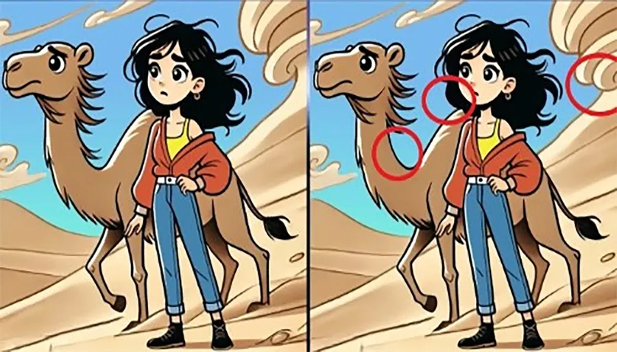 Dacă nici până acum nu ați găsit cele trei diferențe, o să deslușim misterul și o să indicăm exact locul în care acestea apar. Mai exact, prima diferență se regăsește în partea stângă a imaginii, la nivelul gâtului cămilei. A doua diferență este vizibilă tot în partea stângă, de data aceasta la nivelul părului tinerei. Iar a treia diferență este prezentă în extrema dreaptă, la duna de nisip.