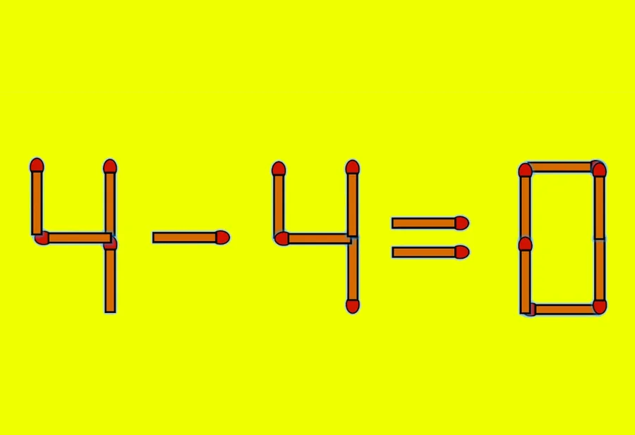 11 – 4 = 0 este greșit, așa că trebuie să vă gândiți cum ar trebui mutat strategic bățul, pentru a obține o ecuație corectă din punct de vedere matematic. Nu vă mai ținem prea mult timp în suspans și vă spunem că bățul trebuie mutat de la primul 1, din numărul 11, pentru a obține 4. Prin urmare 4 – 4 = 0 este corect! Noi am atașat în cadrul acestui articol, mai jos, o imagine unde se vede ecuația corectă. Așa îți va fi mai ușor să-ți dai seama despre ce este vorba!