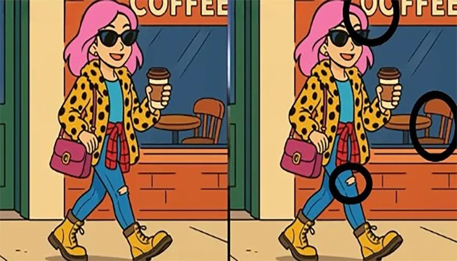 Dacă nici până acum nu ați găsit cele trei diferențe, o să deslușim misterul și o să indicăm exact locul în care acestea apar. Mai exact, prima diferență se regăsește în partea de sus a imaginii, la scrisul de pe cafenea. A doua diferență se regăsește la nivelul genunchiului femeii. Iar a treia diferență în partea dreaptă a imaginii, la nivelul scaunului. Toate cele trei diferențe sunt evidențiate mai jos.