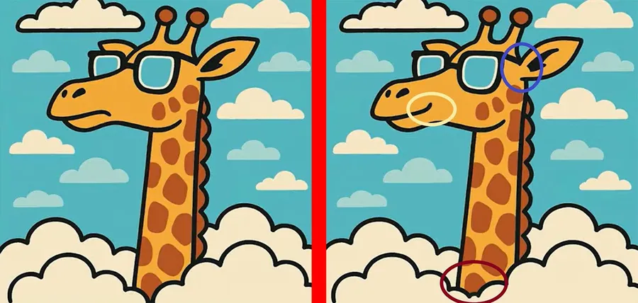 Ești pregătit pentru următoarea provocare care îți va testa abilitățile de observare și cât de atent ești? Observă aceste două imagini cu o girafă care poartă ochelari. La prima vedere, ele pot părea identice, dar dacă le observi cu atenție, vei descoperi că există 3 diferențe ascunse în imagine