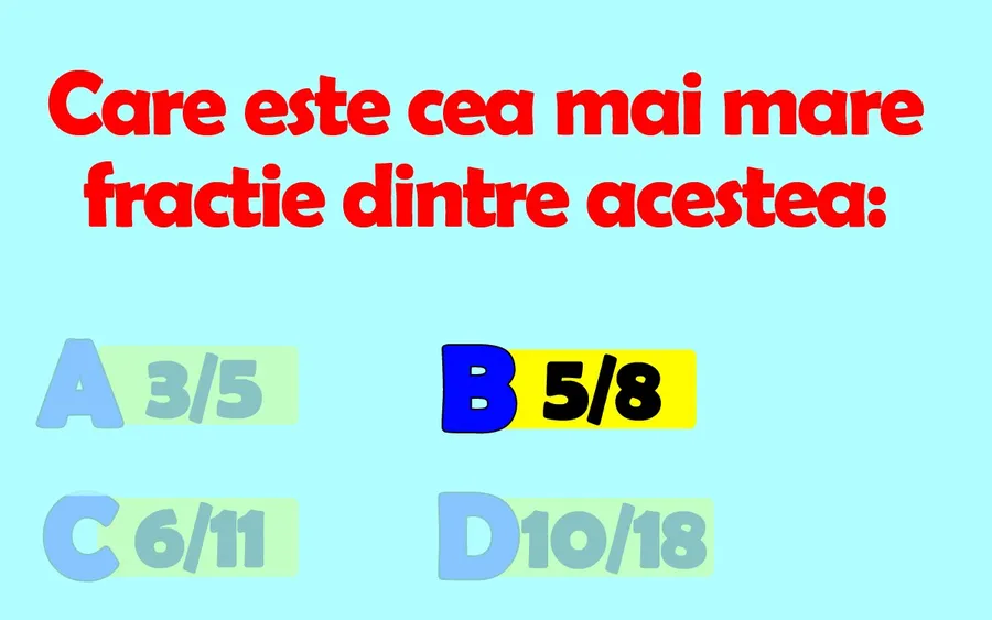 CANCAN.RO ți-a pregătit un test IQ interesant. Care este cea mai mare fracție dintre acestea: 3/5, 5/8, 6/11 sau 10/18? Ești cu adevărat inteligent dacă reușești să rezolvi corect exercițiul.