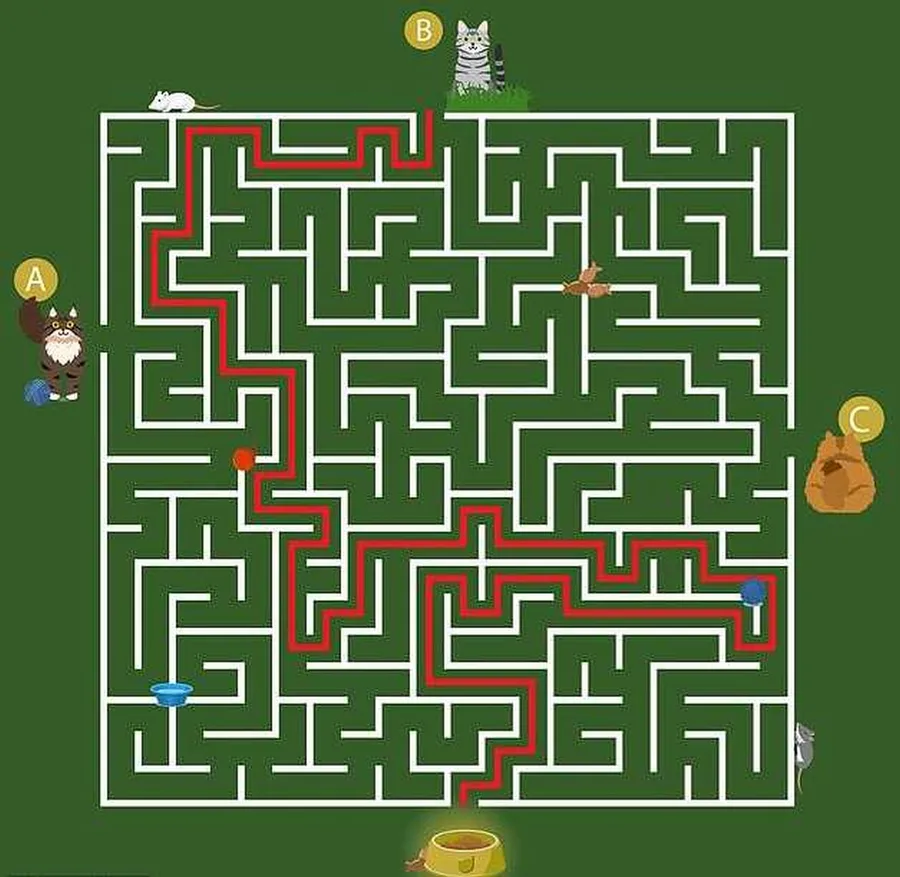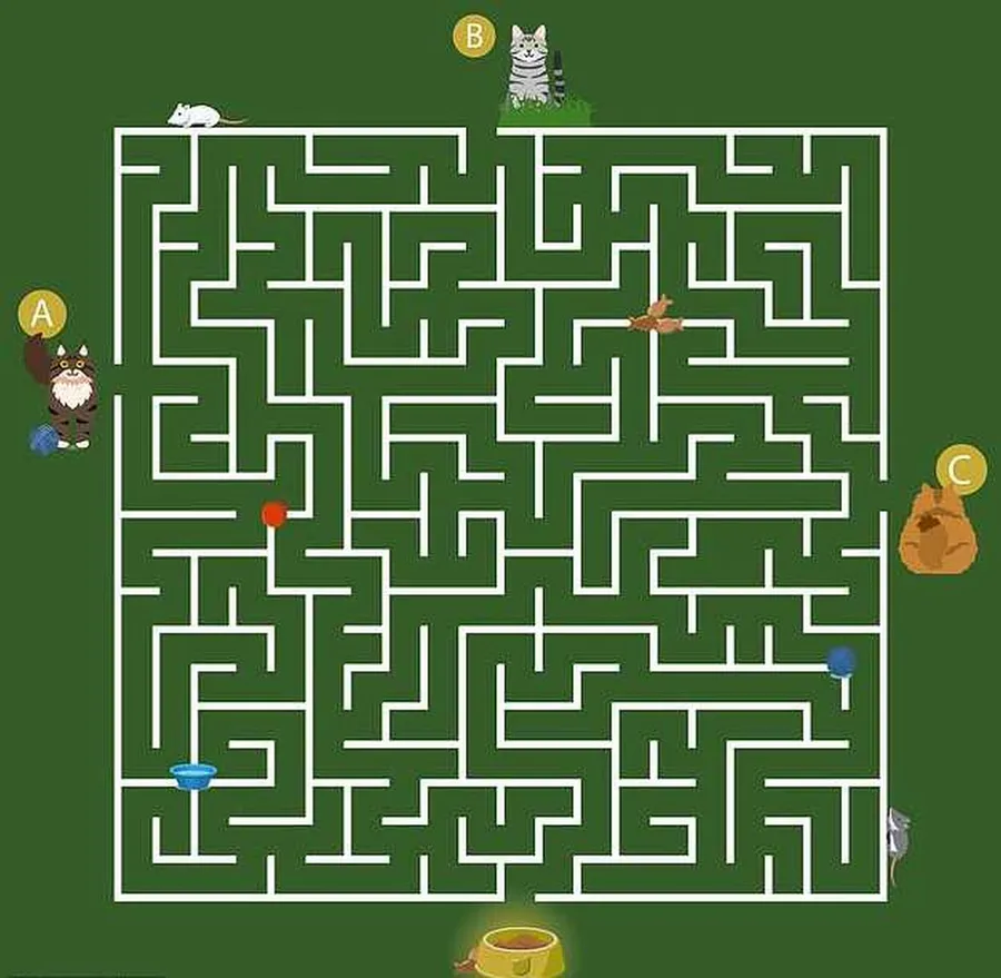 În provocarea de astăzi, este prezentat un labirint în care trei pisici – A, B și C – se află în colțuri diferite, iar în al patrulea colț se află un bol cu mâncare. Sarcina este să identifici, într-un timp limitat de 11 secunde, care dintre cele trei pisici va reuși să ajungă prima la bol, urmând cea mai rapidă și mai simplă cale prin labirint. Pornind cronometrul, cititorii trebuie să analizeze rapid imaginea și să aleagă răspunsul corect.