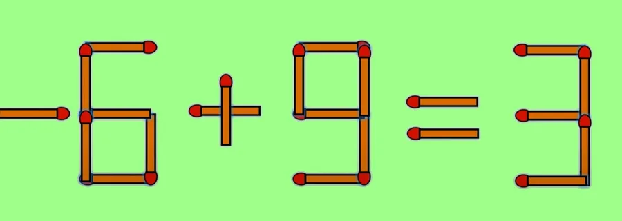 Pentru a corecta egalitatea, tot ce trebuie să faci este să iei bățul de chibrit din partea dreaptă sus, așezat vertical din componența cifrei 8 și să îl muți în fața ei, astfel transformându-se în -6. Acum egalitatea devine corectă: -6 + 9 = 3.