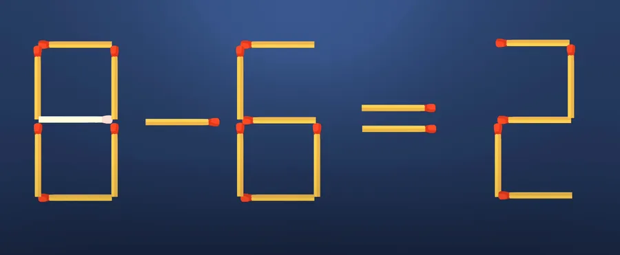 Pentru a corecta egalitatea, tot ce trebuie să faci este să iei bățul de chibrit așezat vertical din componența seului „+”, să îl muți puțin la stânga și să îl așezi în poziție orizontală în mijlocul cifrei 0. Astfel, cifra 0 se transformă în cifra 8, iar egalitatea devine corectă: 8 – 6 = 2.