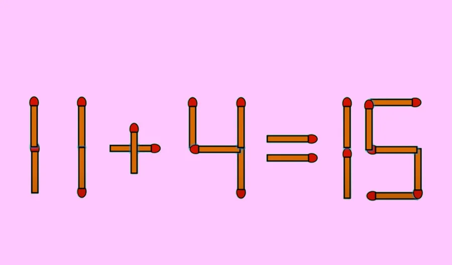 Dacă privești atent, vei observa că, prin repoziționarea unui băț din cifra „4”, aceasta se poate transforma în 11. În acest moment, exercițiul capătă sens și devine perfect corect: 11+4=15, iar testul est trecut.