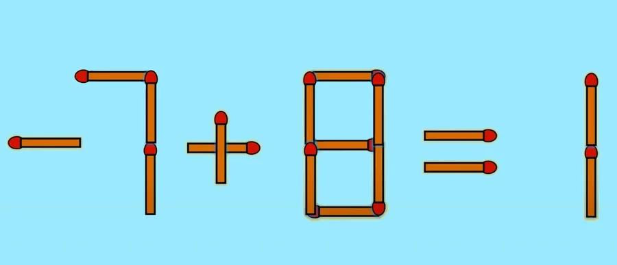 Pentru a corecta egalitatea, tot ce trebuie să faci este să iei bățul de chibrit așezat orizontal, din componența cifrei 7, de după egal, și să îl muți în fața primei cifre a operației. Astfel, egalitatea devine corectă: – 7 + 8 = 1.