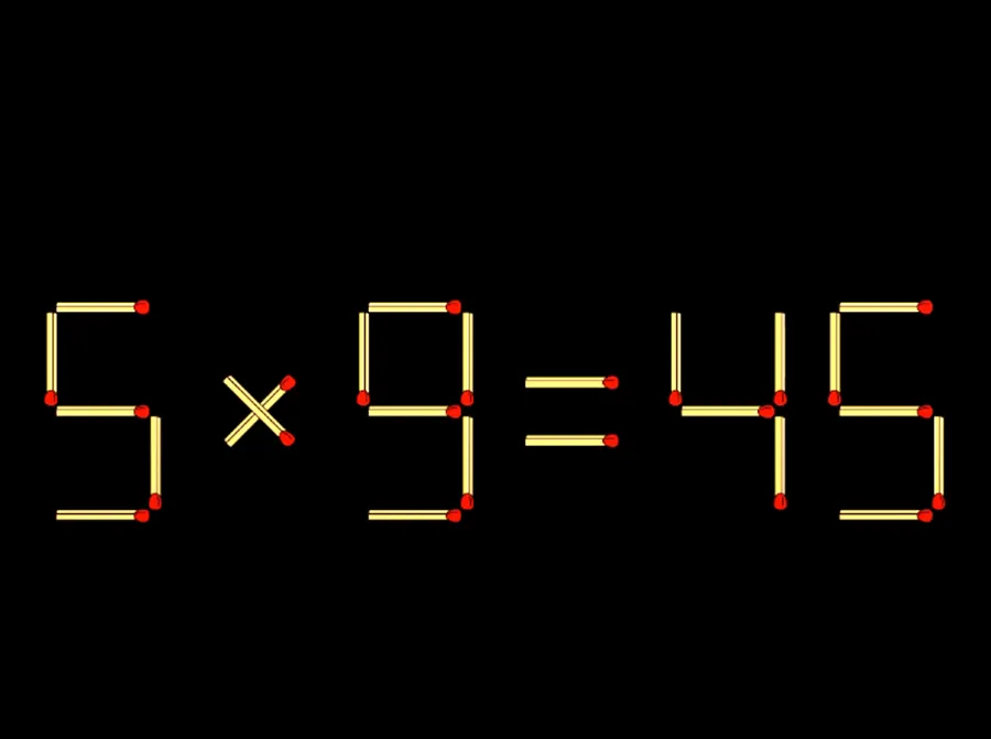 Pentru a corecta egalitatea, tot ce trebuie să faci este să iei un băț de chibrit din ultima cifră (6), astfel încât aceasta să se transforme într-un 5. Așadar, după egal se formează numărul 45. Apoi ne întoarcem la prima cifră de la care o să luăm un băț de chibrit, iar cu acesta și ajutorul celui pe care deja îl avem o să transformăm cifra 4 în cifra 5. Astfel, egalitatea devine corectă: 5×9=45.