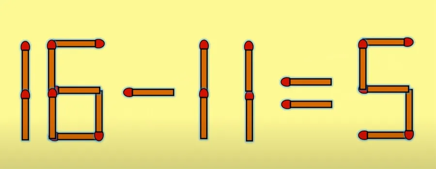 Prin urmare, ca ecuația să fie corectă trebuie să muți un băț de chibrit de la cifra 9 – astfel încât să devină 5 – și să îl muți la cifra 5 – astfel încât 15 să devină 16. Ecuația corectă devine 16 – 11 = 5.