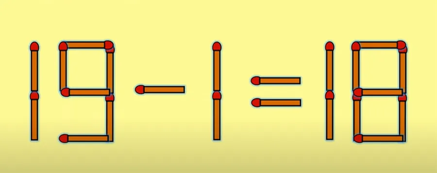 REZOLVARE: Pentru a corecta ecuație trebuie să muți un băț de chibrit vertical de la cifra 8 și să îl adaugi la cifra 9. Astfel 19 devine 19, iar 19 devine 18. Prin urmare, ecuația corectă devine 19 -1 = 18.