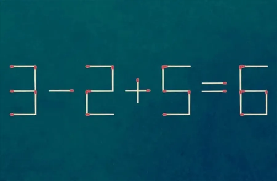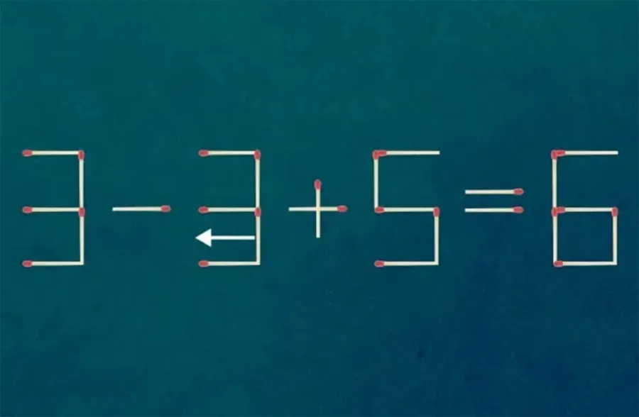 Rezolvare: Așadar, 3 – 3 + 5 = 6 este greșit. Pentru a corecta egalitatea trebuie să mutați bățul de chibrit așezat vertical, cel care formează a doua cifră 3, așa cum arată săgeata în fotografia de mai sus. Bățul de chibrit va fi în aceeași poziție, dar în partea din față, rezultând astfel cifra 2. Echuația finală este 3-2+5=6.