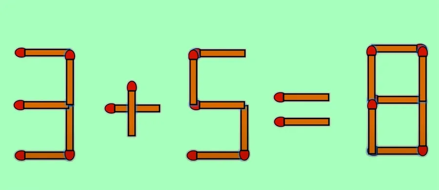 Pentru a corecta egalitatea, tot ce trebuie să faci este să iei bățul de chibrit așezat vertical, în partea dreaptă, în zona de sus, din componența cifrei 3 și să îl muți în partea stângă, sus, astfel încât cifra 3 să se transforme în cifra 5. Așadar, după această mutare egalitatea devine corectă: 3+5=8.