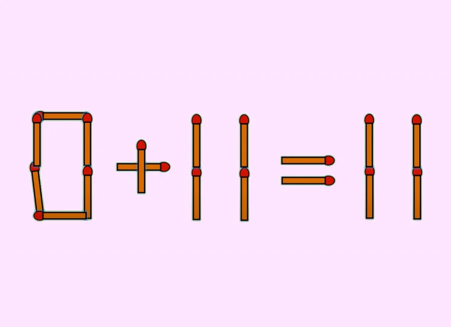 Pentru a corecta egalitatea, tot ce trebuie să faci este să iei al doilea băț de chibrit așezat orizontal din componența cifrei 9 și să îl așezi în poziție verticală, în partea stângă. Astfel, cifra 9 se transformă în cifra 0. Acum egalitatea este corectă: 0 + 11 = 11.