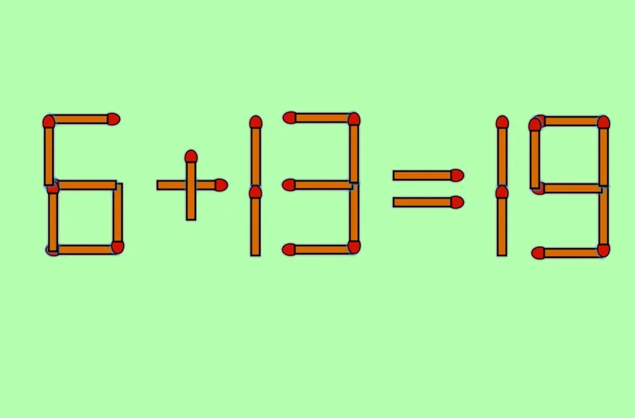 REZOLVARE: Pentru a corecta ecuația 9 + 13 = 19, trebuie să muți un singur băț de chibrit vetical de la cifra 9 astfel încât să devină 6. Prin urmare, ecuația corectă devine 6 + 13 = 19.
