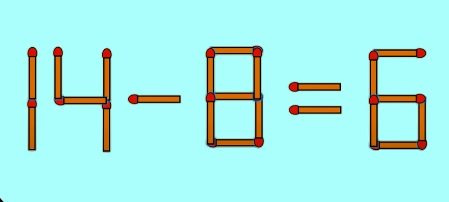 Pentru a corecta egalitatea, tot ce trebuie să faci este să iei bățul de chibrit așezat vertical din componența semnului „+” și să îl așezi în lateralul cifrei 6, tot în poziție verticală. Astfel, cifra 6 se transformă în cifra 8, iar egalitatea devine corectă: 14 – 8 = 6.
