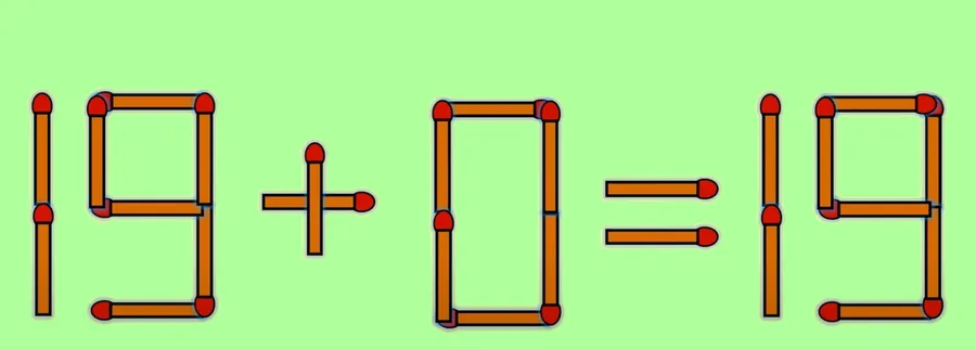 Pentru a corecta egalitatea, tot ce trebuie să faci este să iei un băț de chibrit de la 18 și să îl muți puțin la 15 pentru a crea o egalitate corectă. Astfel, egalitatea devine 19 + 0 = 19.