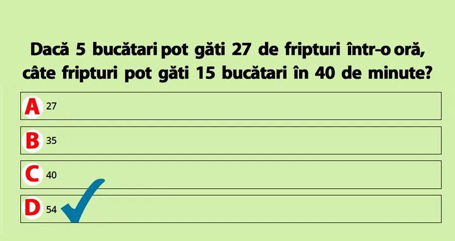 Testul de astăzi are o dificultate ridicată și necesită ceva mai multă atenție și concentrare. Misiunea este aparent simplă. Tot ce trebuie să faci este să descoperi câte fripturi pot găti 15 bucătari în 40 de minute, dacă 5 bucătari pot găti 27 de fripturi într-o oră. Atenţie! Timpul este limitat. Încearcă să găseşti răspunsul corect cât mai repede!
