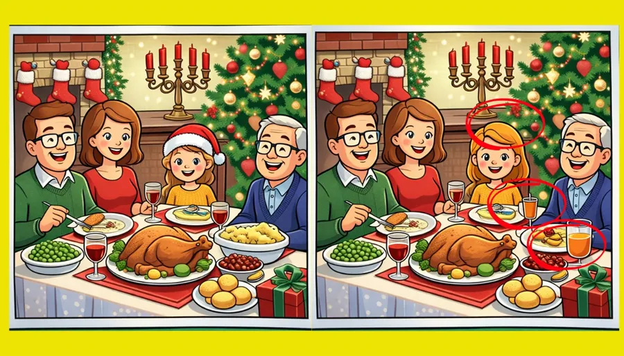 De exemplu, de câte ori ați văzut o persoană purtând o pălărie de Moș Crăciun în timp ce mănâncă friptură la masa de Crăciun? Dacă te uiți atent, există diferențe minore între cele două imagini. Ai doar 16 secunde să găsești cele trei greșeli și să vezi cât de bune sunt abilitățile tale de atenție la detalii! Aceste teste nu numai că distrează, dar ajută și la îmbunătățirea concentrării și a memoriei vizuale. Ești pregătit pentru provocarea de a-ți pune la lucru abilitățile de observare și de a găsi toate diferențele ascunse?