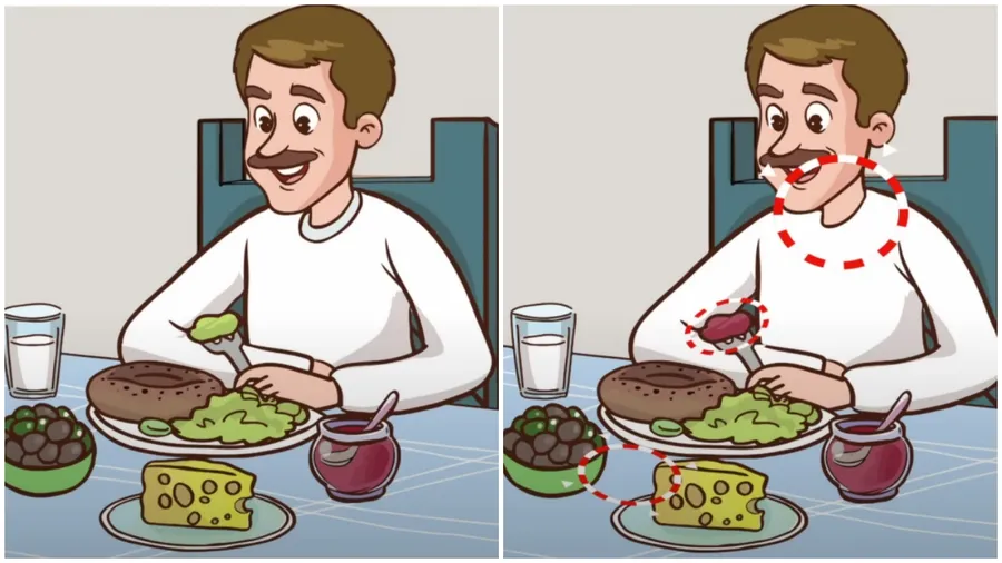 Dacă nici până acum nu ați găsit cele trei diferențe, o să deslușim misterul și o să indicăm exact locul în care acestea apar. Mai exact, prima diferență se regăsește la nivelul gâtului bărbatului. A doua diferență se regăsește la nivelul mâncării din furculiță. Iar a treia se sesizează pe masă.