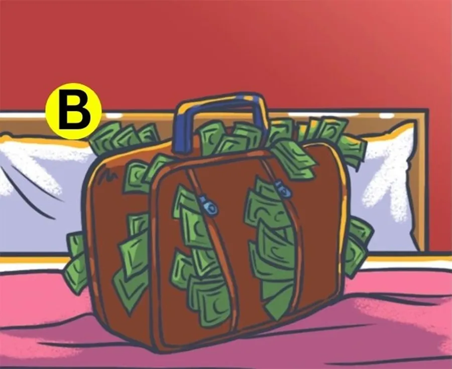 -Camera B conține o pungă plină cu bani, așezată pe un pat.