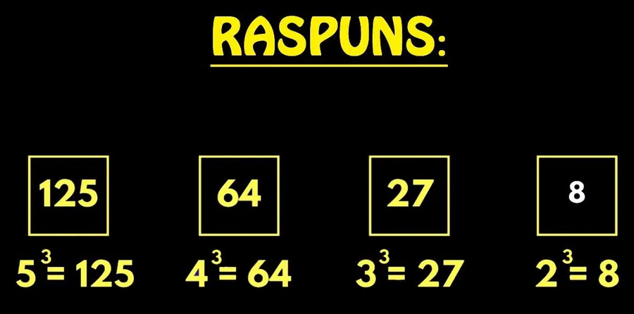 Nu este dificil să rezolvi acest test. Cei familiarizați cu matematica au un avantaj. Trebuie să identifici numărul care urmează în seria: 125, 64, 27.