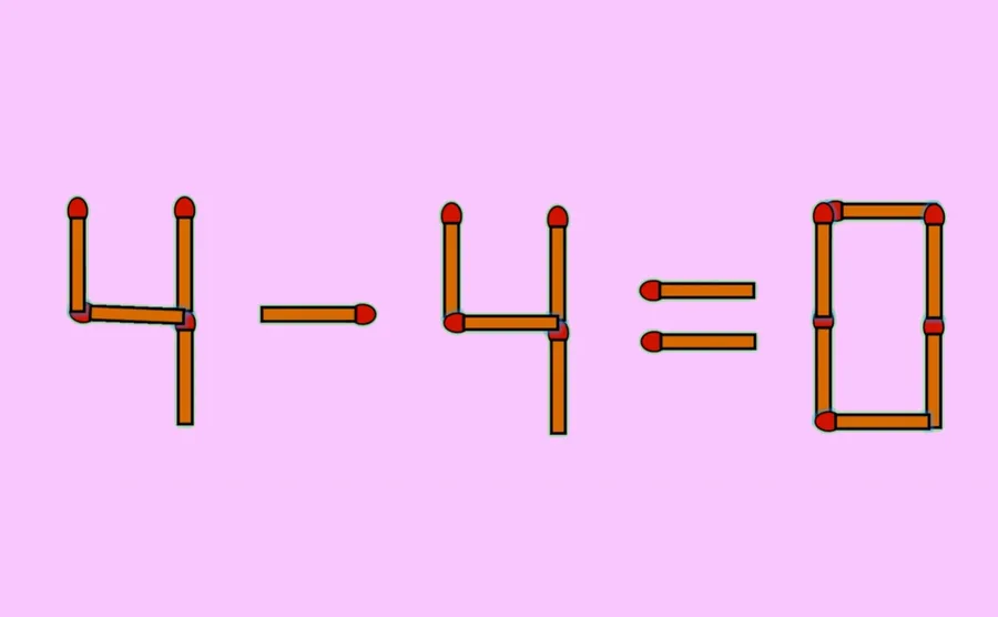Ecuația 11 – 4 = 0 este greșită. Pentru a o corecta, trebuie să muți un băț de chibrit de la cifra 11, astfel încât să devină 4. Prin urmare, ecuația corectă devine 4 – 4 = 0.