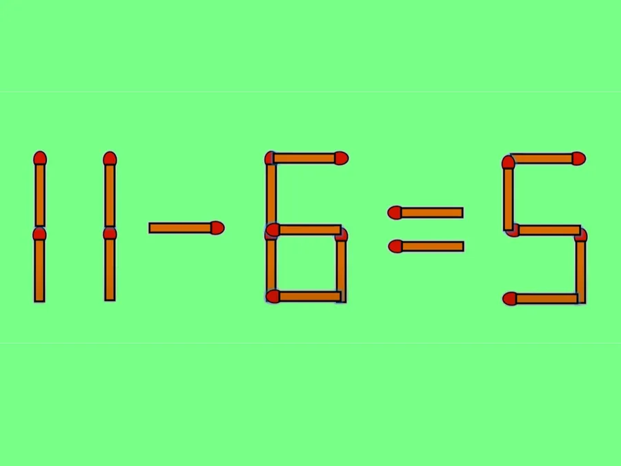 Ei bine, 11 + 5 = 5 este greșit, iar pentru a corecta egalitatea trebuie să mutați bățul de chibrit așezat vertical, cel care formează semnul +, în componența cifrei 5, în aceeași poziție. În acest fel, veți obține 11 – 6 = 5. Priviți ecuația mai jos, scrisă din bețe de chibrit, pentru a înțelege mai bine!