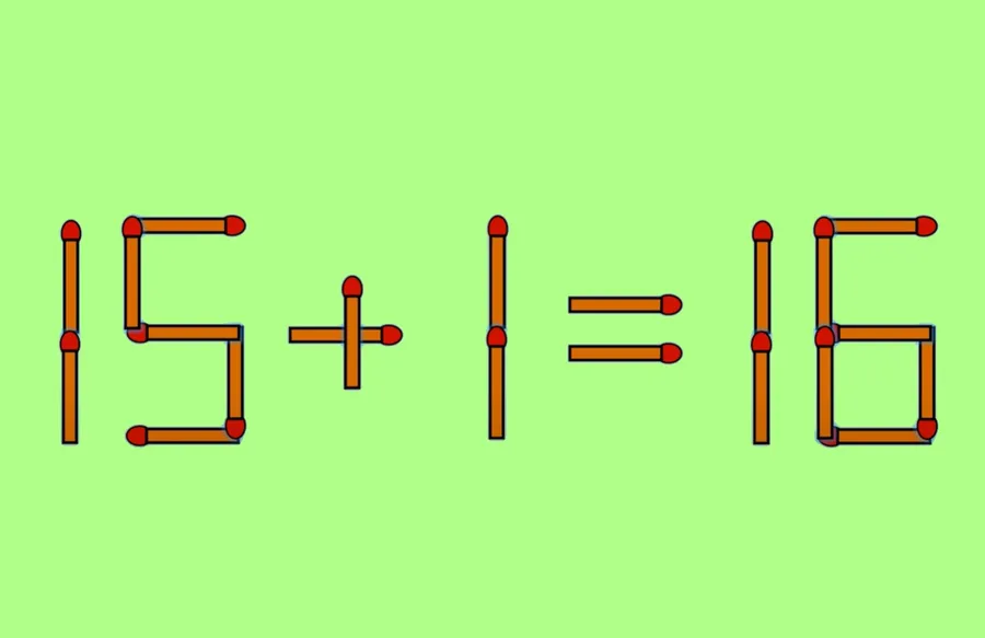 Rezolvare: Așadar, 16 – 1 = 16 este greșit, iar pentru a corecta egalitatea trebuie să mutați bățul de chibrit așezat vertical, cel care formează prima cifră 6, peste semnul – pentru a forma semnul +. În acest fel, veți obține 15 + 1 = 16. Priviți ecuația mai jos, scrisă din bețe de chibrit, pentru a înțelege mai bine!