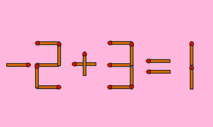 Rezolvare: Așadar, 2 + 9 = 1 este greșit, iar pentru a corecta egalitatea trebuie să mutați bățul de chibrit așezat vertical, cel care formează cifra 9, în fața lui 2, având rolul semnului -. În acest fel, veți obține – 2 + 3 = 1. Priviți ecuația mai jos, scrisă din bețe de chibrit, pentru a înțelege mai bine!