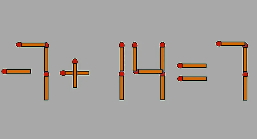 Rezolvare: Așadar, 7 + 74 = 7 este greșit, iar pentru a corecta egalitatea trebuie să mutați bățul de chibrit așezat orizontal, cel care formează cifra 7 a numărului 74, înainte de prima cifră 7. În acest fel, veți obține – 7 + 14 = 7. Priviți ecuația mai jos, scrisă din bețe de chibrit, pentru a înțelege mai bine!