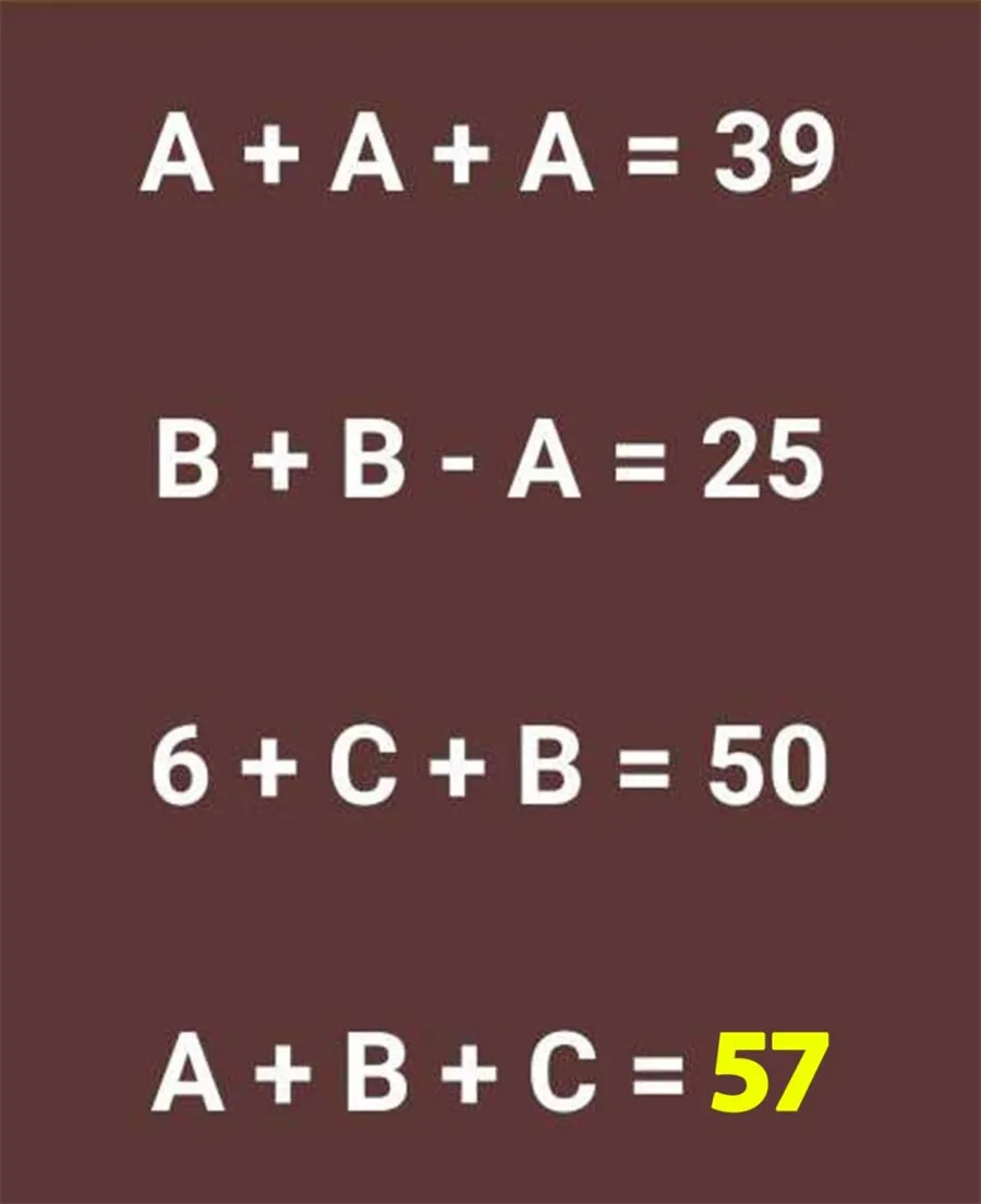 Dacă A + A + A = 39, atunci 3A = 39, rezultă că A = 13.