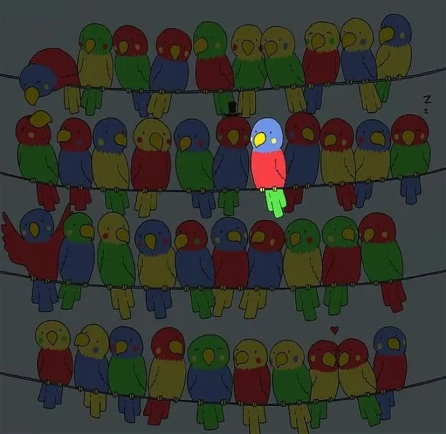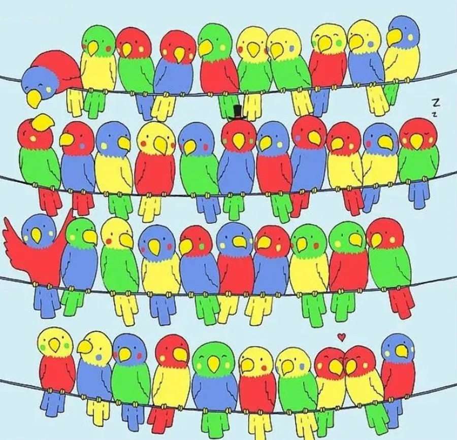 Printre ei se ascunde un papagal care la prima vedere se confundă ușor cu ceilalţi Misiunea ta este clară, dar solicitantă: găsește papagul fără pereche.