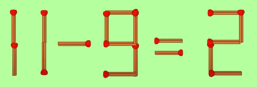 Pentru a-ți face munca mai ușoară și pentru a nu te mai ține în suspans, îți vom dezvălui răspunsul corect. Trebuia să muți un băț de chibrit de la cifra 4, astfel încât să se transforme în 11. Va rezulta ecuația 11-9-3, rezultat incorect. Astfel, pentru ca ecuația să fie validă se va muta al doilea băț de chibrit de la cifra 3 pentru a rezulta cifra 2. Ecuația devine 11-9 =2