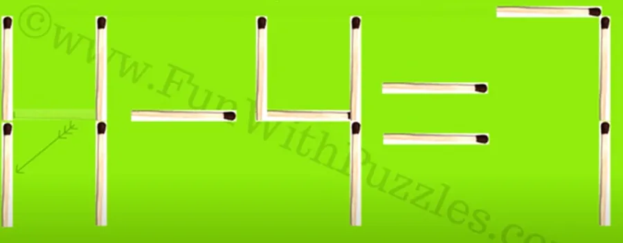 Rezolvare: La o primă vedere, calculul nu pare să aibă nicio logică. În plus, am fi tentați să spunem că mutarea niciunui băț de chibrit nu ar putea influența acest calcul. Cu multă atenție putem observa însă că dacă bățul de chibrit de la prima cifră 4 este îndreptat, obținem numărul 11. Astfel, calculul are brusc logică, 11-4=7 fiind corect.