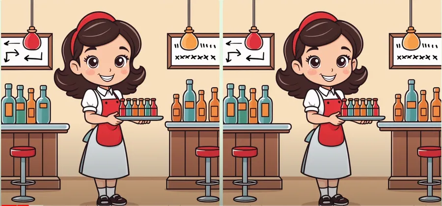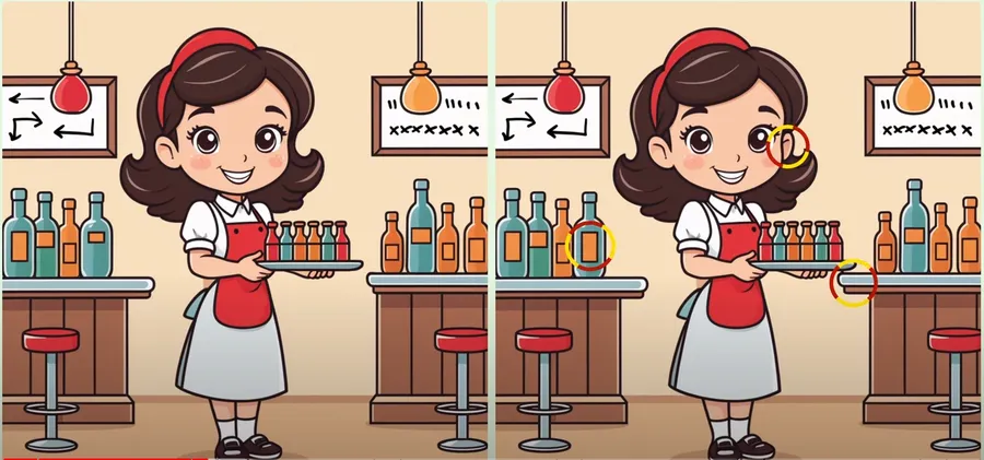 Dacă nici până acum nu ați găsit cele trei diferențe, o să deslușim misterul și o să indicăm exact locul în care acestea apar. Mai exact, prima diferența se regăsește în partea stângă a imaginii, la nivelul ultimei sticle albastre. Eticheta portocalie a acestei este de dimensiuni diferite și are o altă poziționare. Cea de-a doua diferență se află în drapata imaginii: în prima imaginea se vede doar o ureche a fetei, în timp ce în a doua imagine se văd ambele. Cea de-a treia diferență este sesizabilă la nivelul celui de-al doilea bar, în una din imagini acesta fiind ocupat în întregime, iar în alta nu.