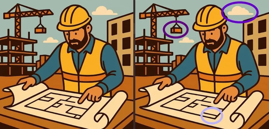 Dacă nici până acum nu ați găsit cele trei diferențe, o să deslușim misterul și o să indicăm exact locul în care acestea apar. Mai exact, prima diferență se găsește în partea de sus, la nivelul pachetului ridicat de macara. A doua este sesizabilă la nivelul norilor. Iar a treia diferență se regăsește la nivelul planșei pe care privește constructorul. Toate cele trei diferențe sunt evidențiate mai jos.