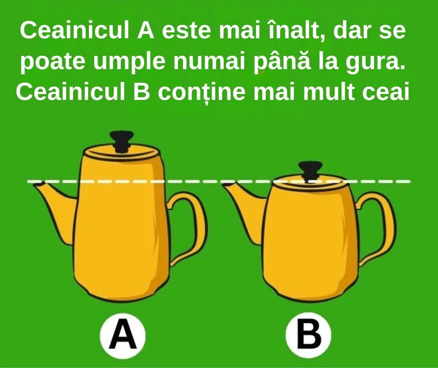 REZOLVARE: Pentru cei care nu au putut răspunde la timp, nu vă faceți griji. Această provocare este concepută în mod intenționat pentru a pune în dificultate chiar și persoanele cu IQ ridicat. Prin urmare, ceainicul A este mai înalt, dar se poate umple numai până la gură. Astfel că ceainicul B conține mai mult ceai.