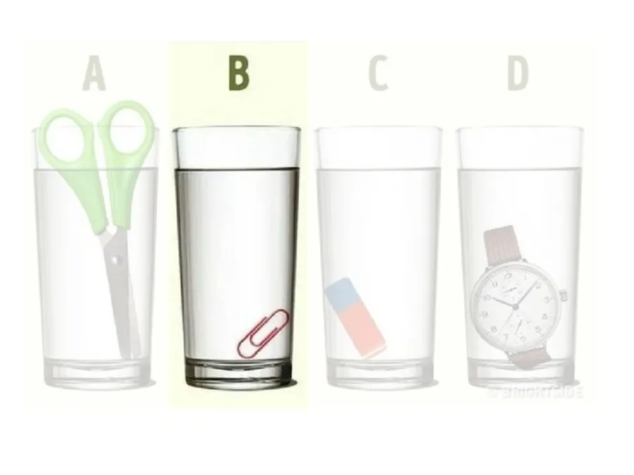 Ai analizat cu atenție imaginea? Dacă da, cu siguranță ai observat că în paharul B se află o agrafă mică. Comparativ cu celelalte obiecte voluminoase din paharele A, C și D, în paharul B se află cel mai ușor obiect. În momentul în care celelalte obiecte din pahare vor fi scoase din apă, nivelul apei va scădea. Astfel, în momentul în care obiectul din paharul B este scos, nivelul apei nu va fi modificat foarte mult, acolo fiind cel mai puțin voluminos obiect.
